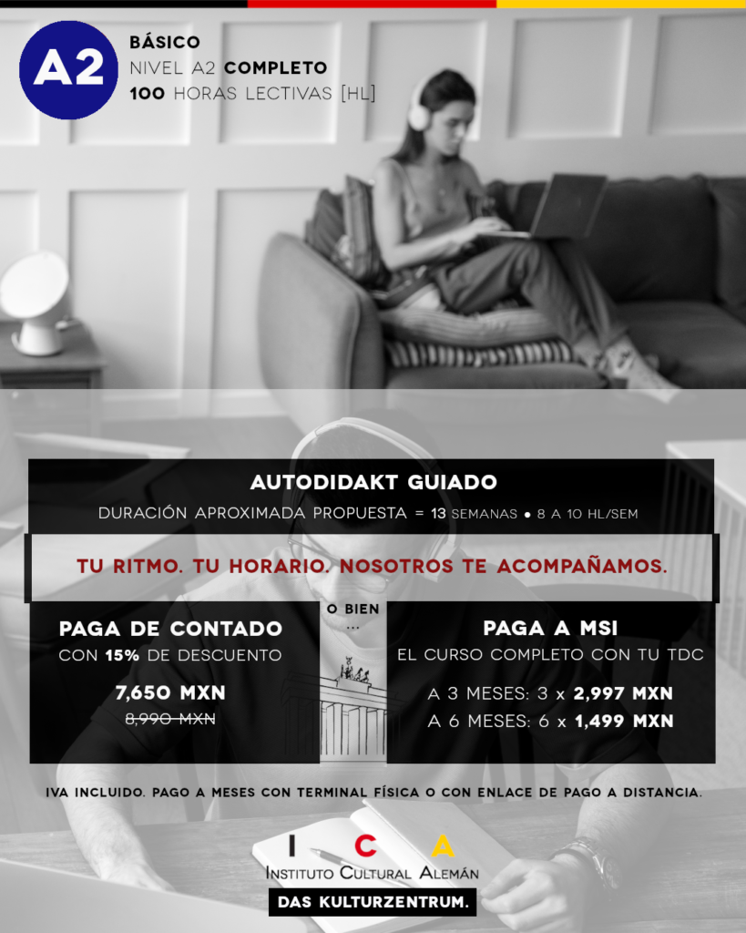 El curso A2 aborda una variedad de temas esenciales para la comunicación en alemán, incluyendo viajes, ámbito familiar y árbol genealógico, así como vocabulario sobre lugares, frecuencia y objetos del hogar. Se exploran también comparaciones, normas sociales como las reglas de invitaciones en Alemania, y aspectos relacionados con fiestas, regalos, sentimientos, intereses y opiniones. Además, los estudiantes aprenderán a expresar deseos, elaborar un currículo profesional, y conocer el sistema educativo alemán y los negocios. Se incluyen temas prácticos como consejos, propuestas, avisos de seguridad y anuncios.